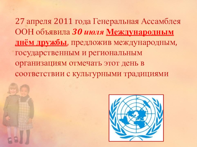 днём дружбы, предложив международным, государственным и региональным организациям отмечать этот день в соответствии с культурными традициями