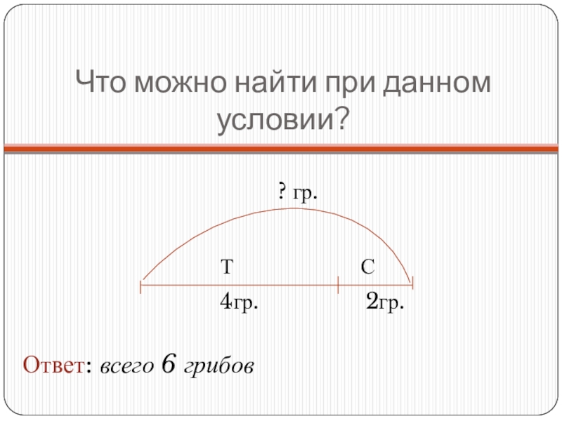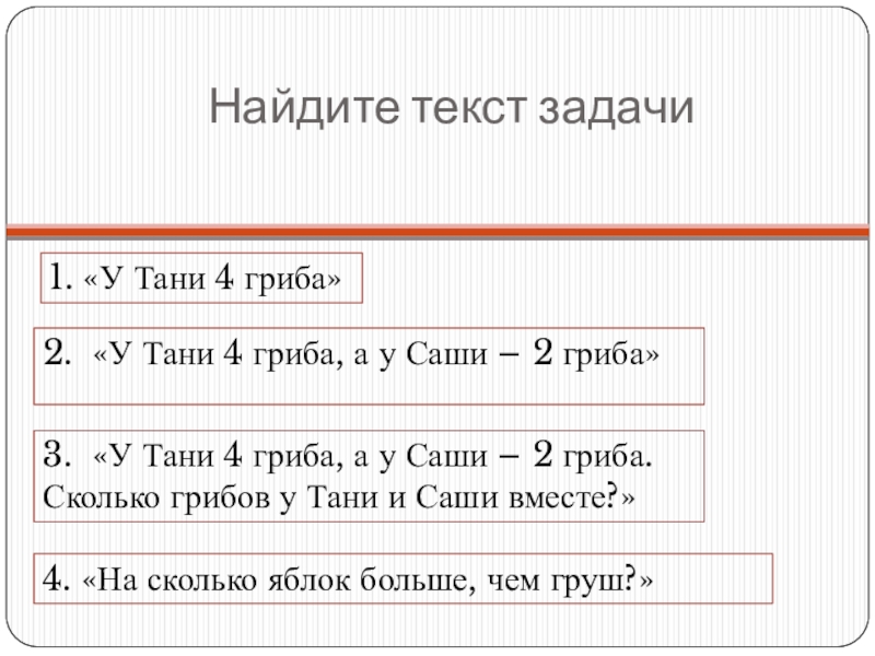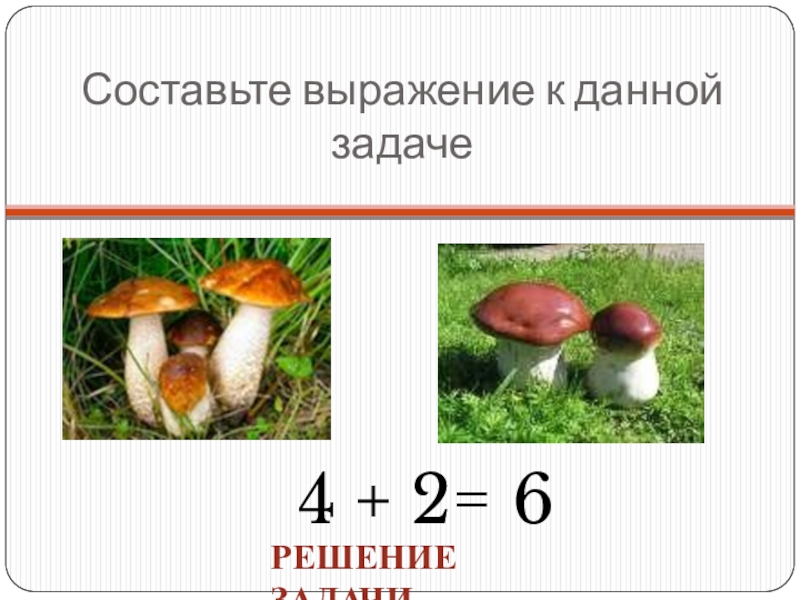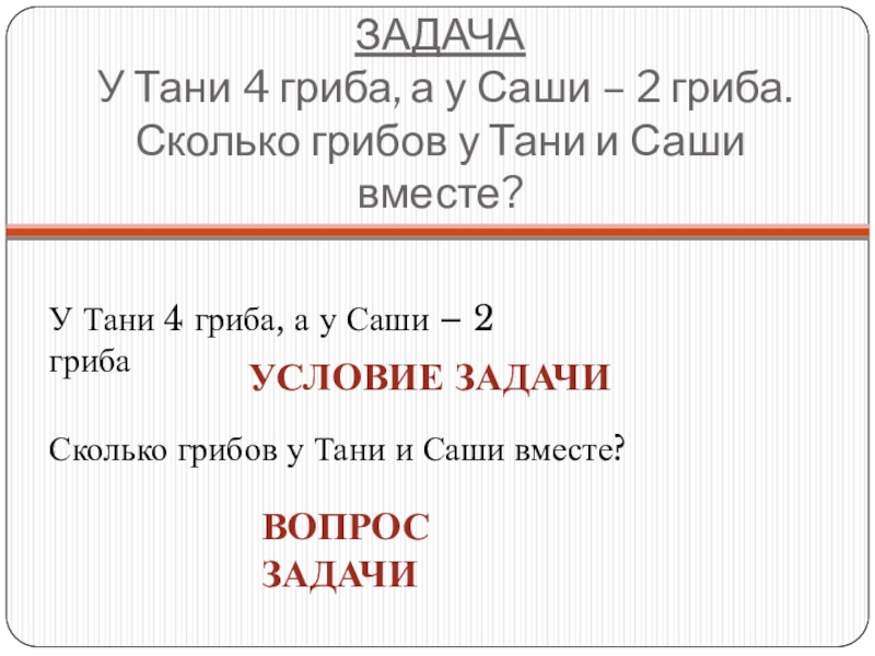 3. «У Тани 4 гриба, а у Саши – 2 гриба. Сколько грибов у Тани и Саши вместе?»