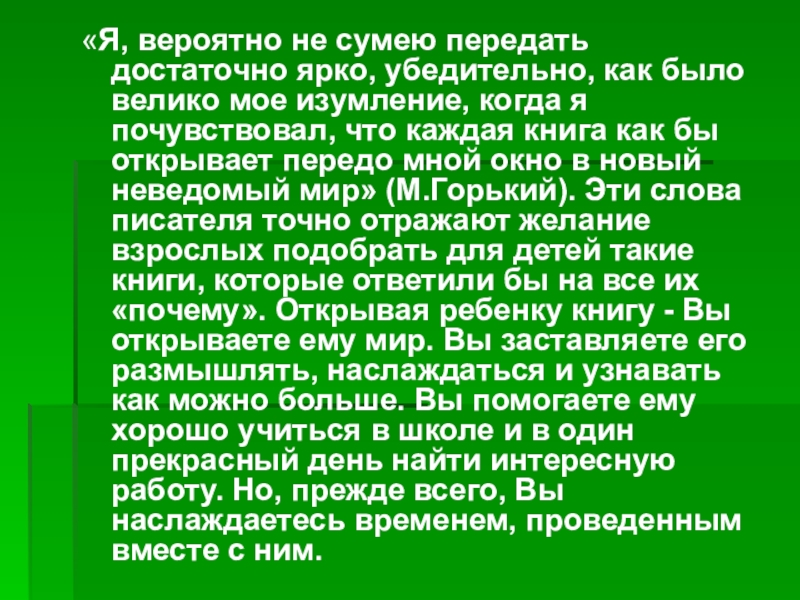 мое изумление, когда я почувствовал, что каждая книга как бы открывает передо мной окно в новый неведомый мир» (М.Горький). Эти слова писателя точно отражают желание взрослых подобрать для детей такие книги, которые ответили бы на все их «почему». Открывая ребенку книгу - Вы открываете ему мир. Вы заставляете его размышлять, наслаждаться и узнавать как можно больше. Вы помогаете ему хорошо учиться в школе и в один прекрасный день найти интересную работу. Но, прежде всего, Вы наслаждаетесь временем, проведенным вместе с ним.