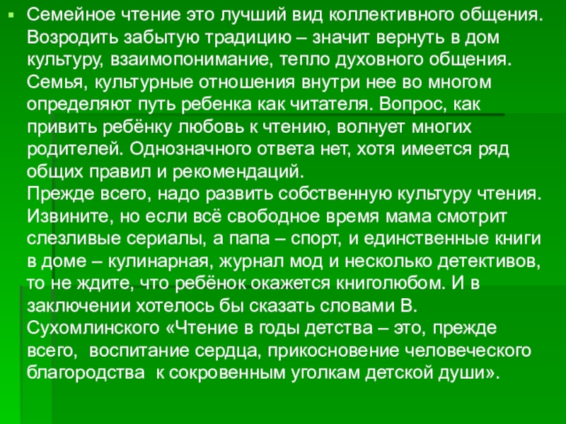 Слайд 19Семейное чтение это лучший вид коллективного общения. Возродить забытую традицию –