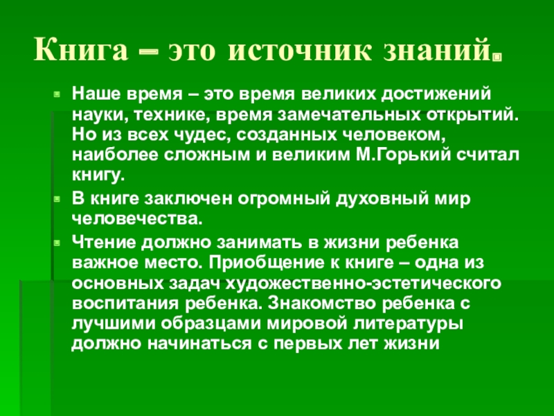 науки, технике, время замечательных открытий. Но из всех чудес, созданных человеком, наиболее сложным и великим М.Горький считал книгу.