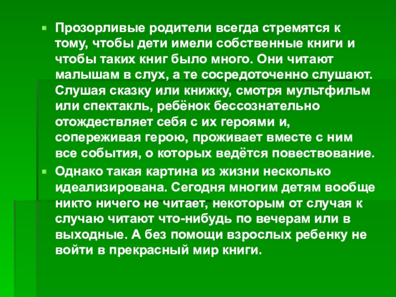 Однако такая картина из жизни несколько идеализирована. Сегодня многим детям вообще никто ничего не читает, некоторым от случая к случаю читают что-нибудь по вечерам или в выходные. А без помощи взрослых ребенку не войти в прекрасный мир книги.