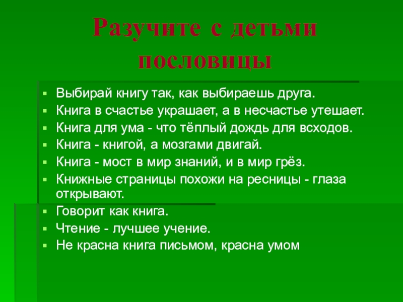 Прежде всего, надо развить собственную культуру чтения. Извините, но если всё свободное время мама смотрит слезливые сериалы, а папа – спорт, и единственные книги в доме – кулинарная, журнал мод и несколько детективов, то не ждите, что ребёнок окажется книголюбом. И в заключении хотелось бы сказать словами В.Сухомлинского «Чтение в годы детства – это, прежде всего, воспитание сердца, прикосновение человеческого благородства к сокровенным уголкам детской души».