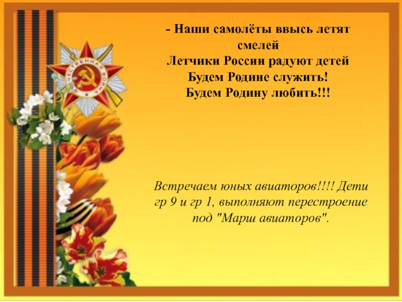 Встречаем юных авиаторов!!!! Дети гр 9 и гр 1, выполняют перестроение под "Марш авиаторов".