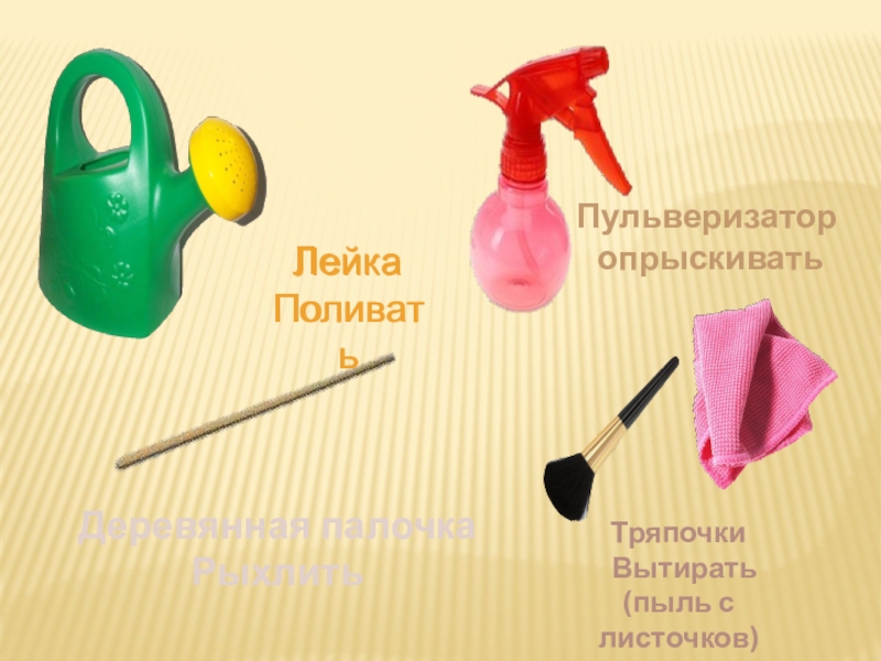 ЛейкаПоливатьДеревянная палочкаРыхлитьПульверизатор опрыскиватьТряпочки Вытирать (пыль с листочков)ЛейкаПоливать