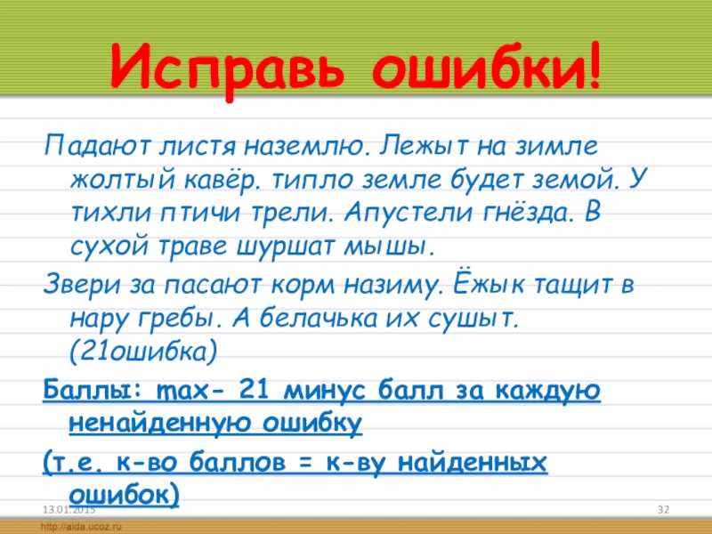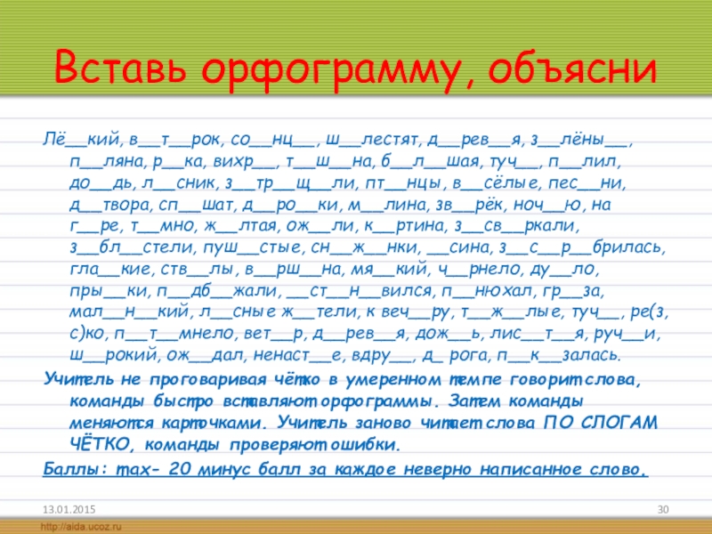 Баллы: max- 20 минус балл за каждое неверно написанное слово.