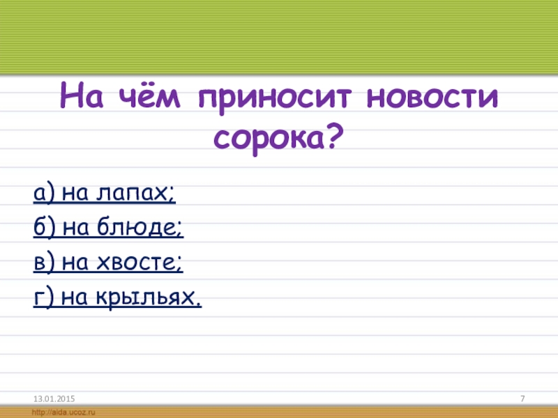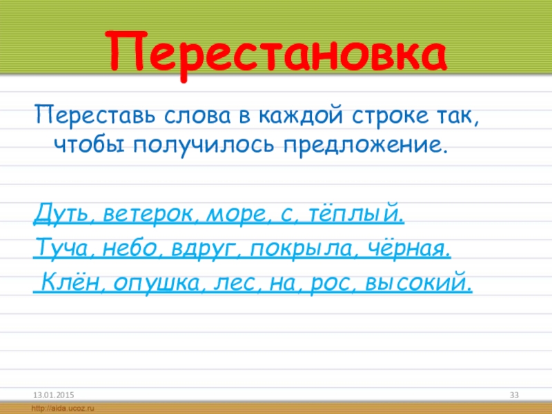 Переставь слова в каждой строке так, чтобы получилось предложение.