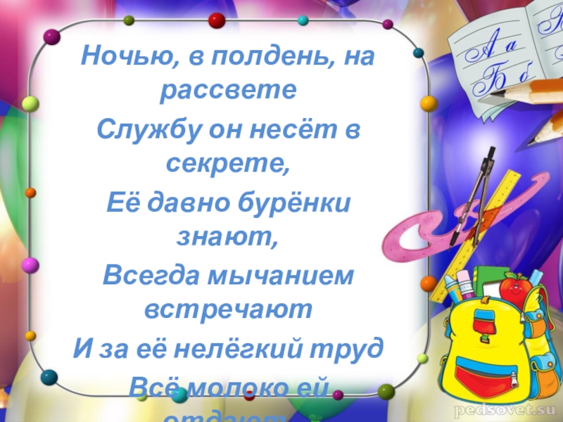 Это сайт презентаций, где можно хранить и обмениваться своими презентациями, докладами, проектами, шаблонами в формате PowerPoint с другими пользователями. Мы помогаем школьникам, студентам, учителям, преподавателям хранить и обмениваться учебными материалами.