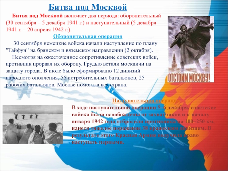 В ходе наступательной операции 5–6 декабря, советские войска были освобождены от захватчиков и к началу января 1942 года отбросили противника на 100–250 км, нанеся тяжелое поражение 38 вражеским дивизиям. В результате этого Красная Армия получила право наступать первыми.