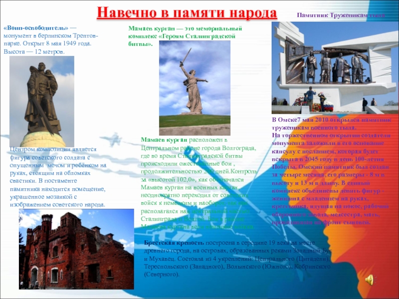 Центром композиции является фигура советского солдата с опущенным мечом и ребёнком на руках, стоящим на обломках свастики. В постаменте памятника находится помещение, украшенное мозаикой с изображением советского народа.