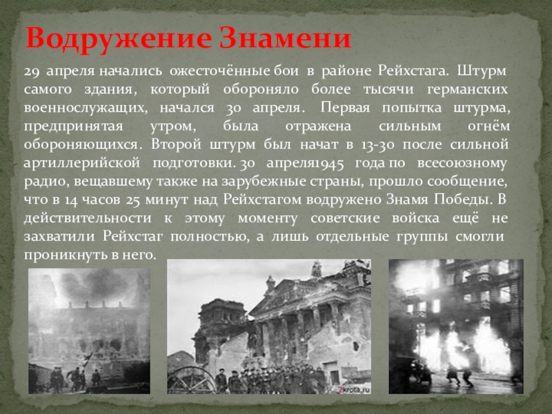 обороняло более тысячи германских военнослужащих, начался 30 апреля. Первая попытка штурма, предпринятая утром, была отражена сильным огнём обороняющихся. Второй штурм был начат в 13-30 после сильной артиллерийской подготовки. 30 апреля1945 года по всесоюзному радио, вещавшему также на зарубежные страны, прошло сообщение, что в 14 часов 25 минут над Рейхстагом водружено Знамя Победы. В действительности к этому моменту советские войска ещё не захватили Рейхстаг полностью, а лишь отдельные группы смогли проникнуть в него.