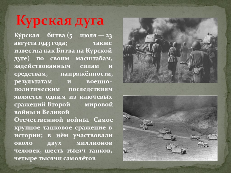 по своим масштабам, задействованным силам и средствам, напряжённости, результатам и военно-политическим последствиям является одним из ключевых сражений Второй мировой войны и Великой Отечественной войны. Самое крупное танковое сражение в истории; в нём участвовали около двух миллионов человек, шесть тысяч танков, четыре тысячи самолётов