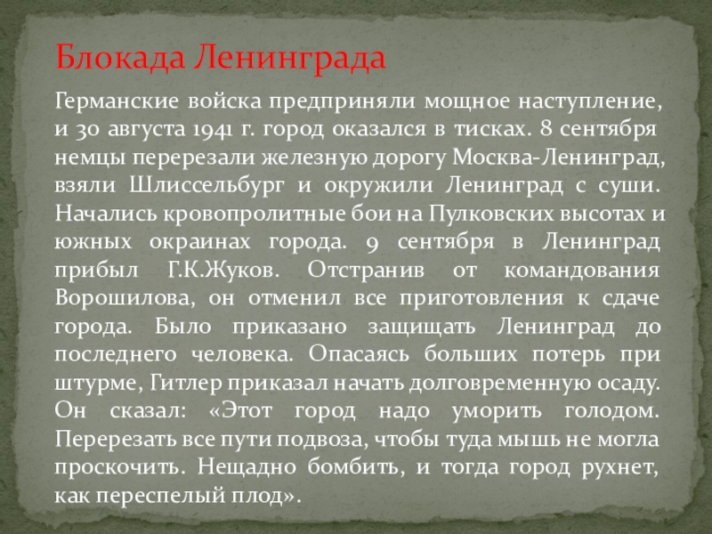 г. город оказался в тисках. 8 сентября немцы перерезали железную дорогу Москва-Ленинград, взяли Шлиссельбург и окружили Ленинград с суши. Начались кровопролитные бои на Пулковских высотах и южных окраинах города. 9 сентября в Ленинград прибыл Г.К.Жуков. Отстранив от командования Ворошилова, он отменил все приготовления к сдаче города. Было приказано защищать Ленинград до последнего человека. Опасаясь больших потерь при штурме, Гитлер приказал начать долговременную осаду. Он сказал: «Этот город надо уморить голодом. Перерезать все пути подвоза, чтобы туда мышь не могла проскочить. Нещадно бомбить, и тогда город рухнет, как переспелый плод».