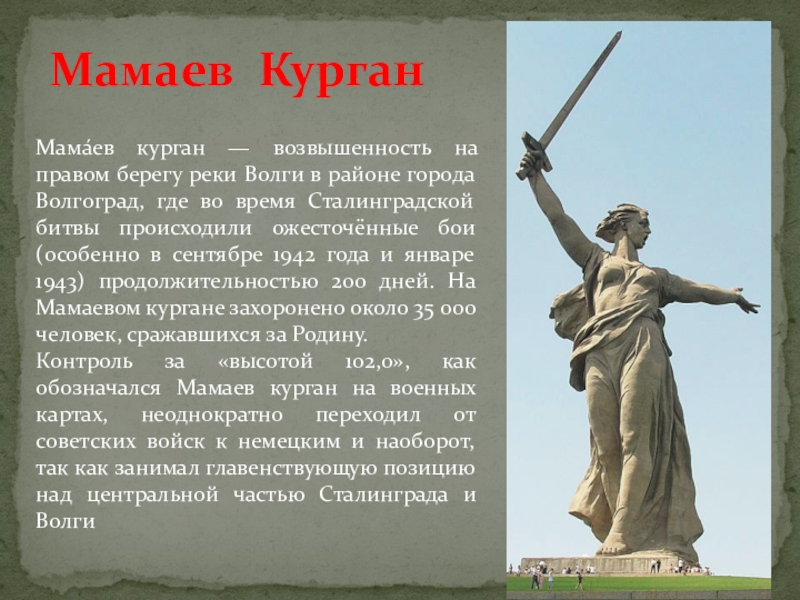 Слайд 16Мама́ев курган — возвышенность на правом берегу реки Волги в районе