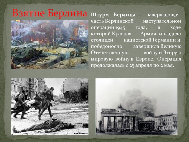 Армия завладела столицей нацистской Германии и победоносно завершила Великую Отечественную войну и Вторую мировую войну в Европе. Операция продолжалась с 25 апреля по 2 мая.