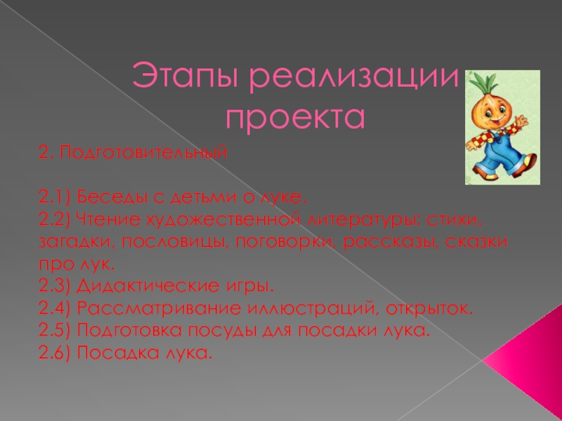 Этапы реализации проекта2. Подготовительный2.1) Беседы с детьми о луке.2.2) Чтение художественной литературы: стихи, загадки, пословицы, поговорки, рассказы,