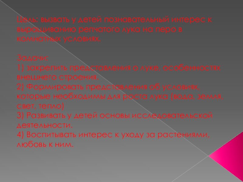 Слайд 4Цель: вызвать у детей познавательный интерес к выращиванию репчатого лука на
