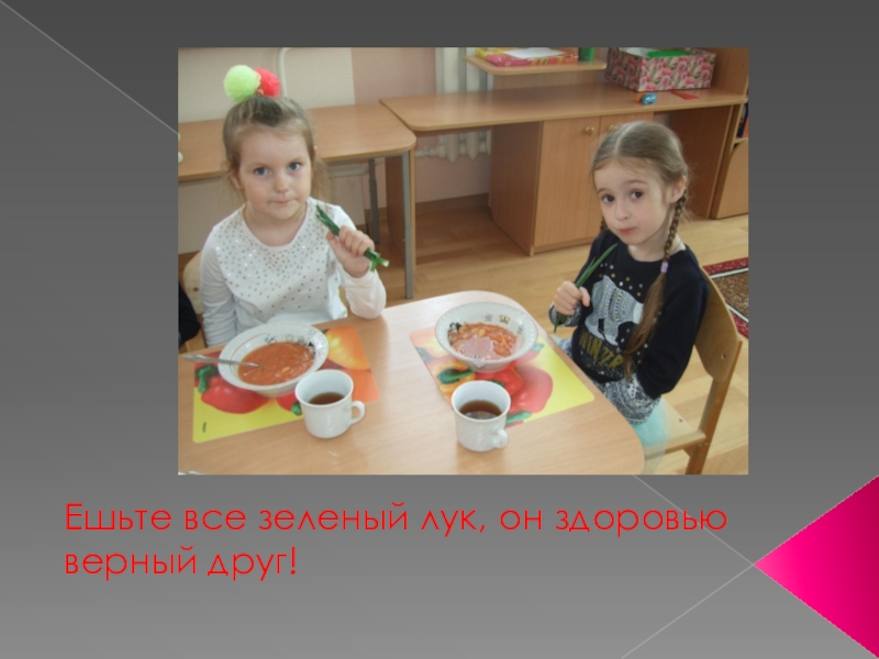 Слайд 19Ешьте все зеленый лук, он здоровью верный друг!