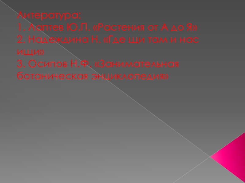 Литература:1. Лаптев Ю.П. «Растения от А до Я» 2. Надеждина Н. «Где щи там и нас ищи»
