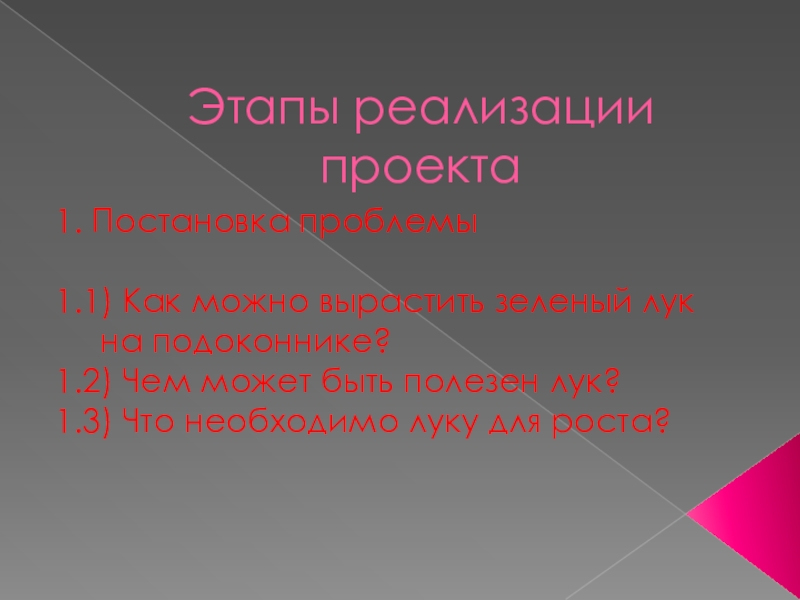 Этапы реализации проекта1. Постановка проблемы1.1) Как можно вырастить зеленый лук на подоконнике?1.2) Чем может быть полезен лук?1.3)