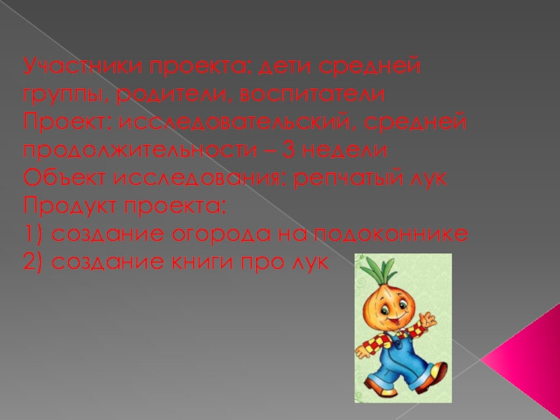 Участники проекта: дети средней группы, родители, воспитатели Проект: исследовательский, средней продолжительности – 3 недели Объект исследования: репчатый