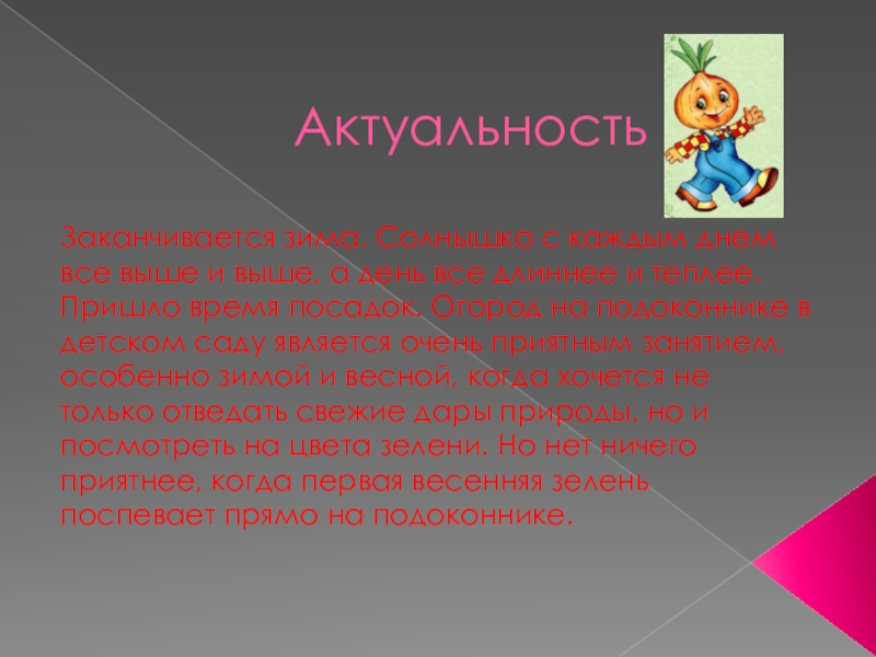 АктуальностьЗаканчивается зима. Солнышко с каждым днем все выше и выше, а день все длиннее и теплее. Пришло