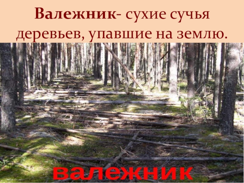 Слайд 12Валежник- сухие сучья деревьев, упавшие на землю.