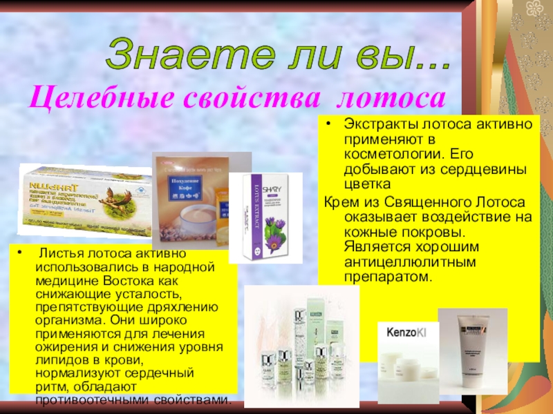 Экстракты лотоса активно применяют в косметологии. Его добывают из сердцевины цветка