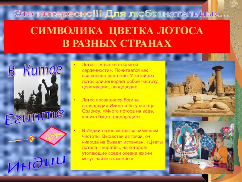 Лотос – «цветок открытой сердечности». Почитается как священное растение. У китайцев лотос олицетворяет собой чистоту, целомудрие, плодородие.