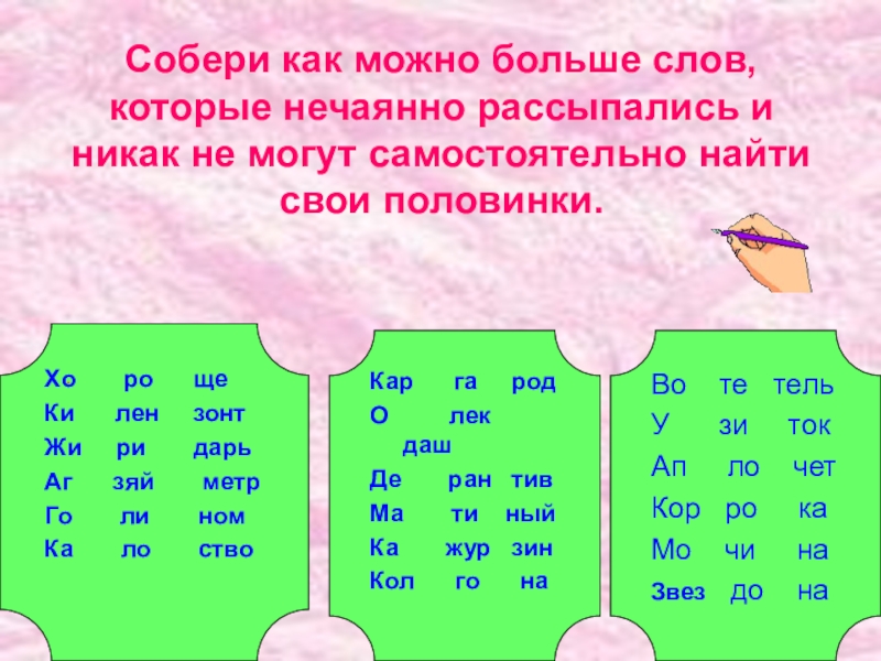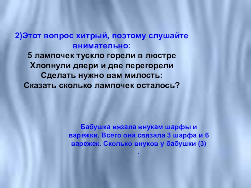 Бабушка вязала внукам шарфы и варежки. Всего она связала 3 шарфа и 6 варежек. Сколько внуков у бабушки (3)