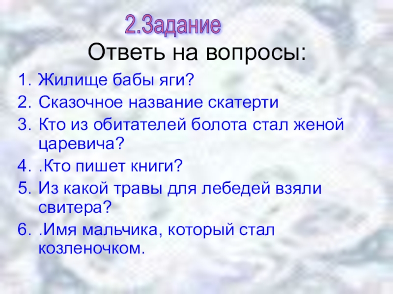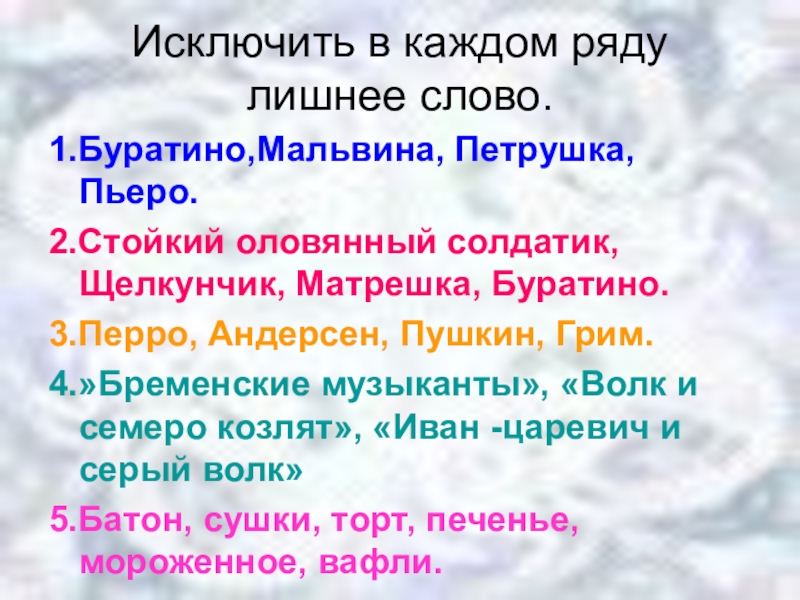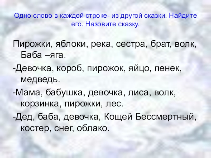 Пирожки, яблоки, река, сестра, брат, волк, Баба –яга.