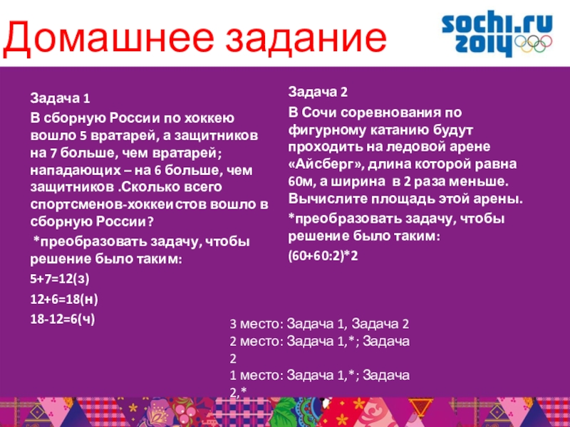 2 место: Задача 1,*; Задача 2