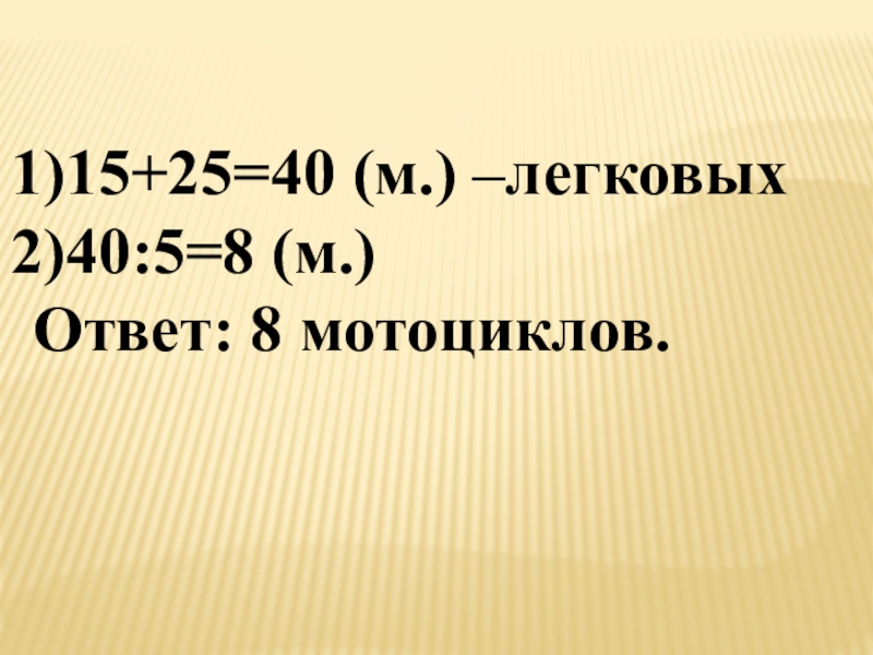 15+25=40 (м.) –легковых40:5=8 (м.)Ответ: 8 мотоциклов.