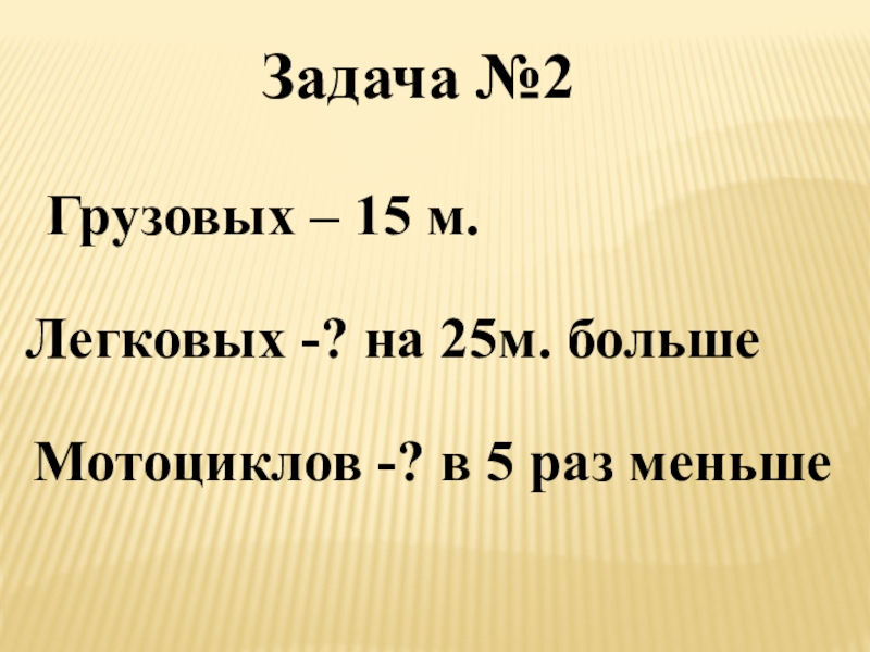 Задача №2Грузовых – 15 м.Легковых -? на 25м. большеМотоциклов -? в 5 раз меньше