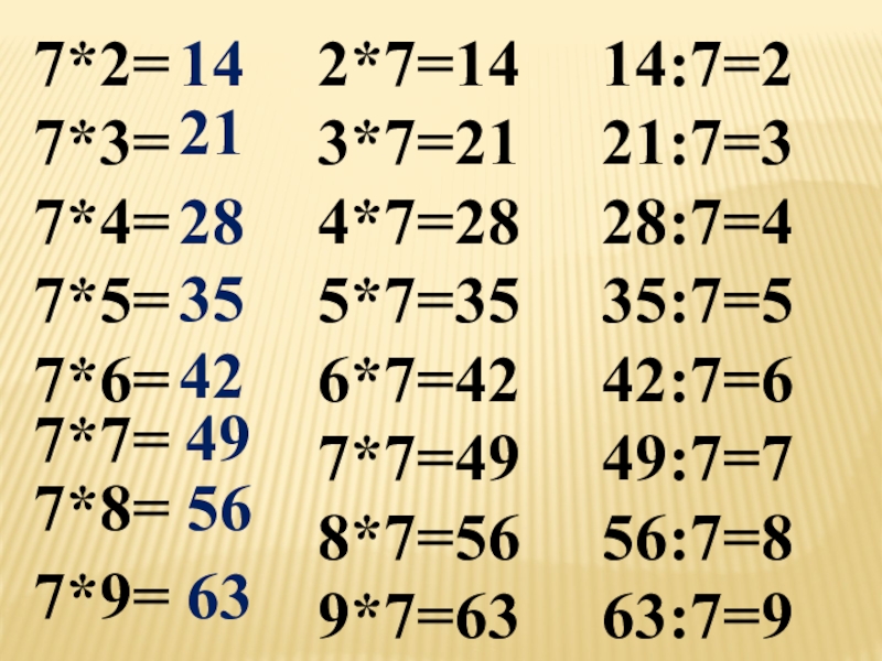 7*2=7*3=7*4=7*5=7*6=14212835427*7=497*8= 56 7*9= 632*7=143*7=214*7=285*7=356*7=427*7=498*7=569*7=6314:7=221:7=328:7=435:7=542:7=649:7=756:7=863:7=9