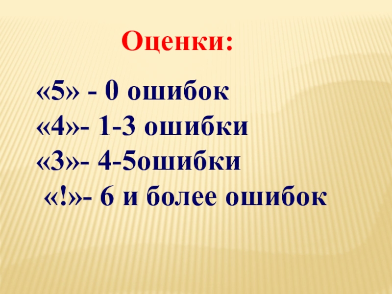 «5» - 0 ошибок«4»- 1-3 ошибки«3»- 4-5ошибки «!»- 6 и более ошибокОценки: