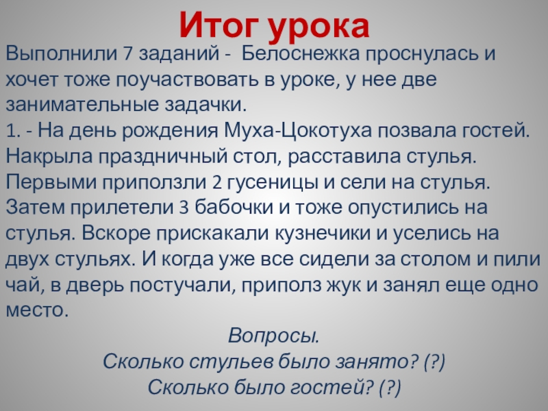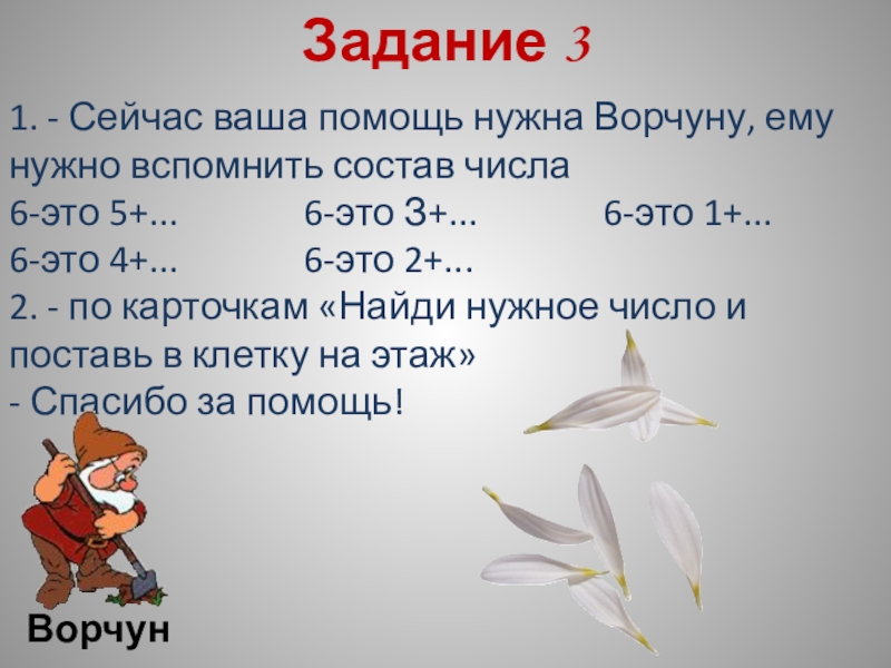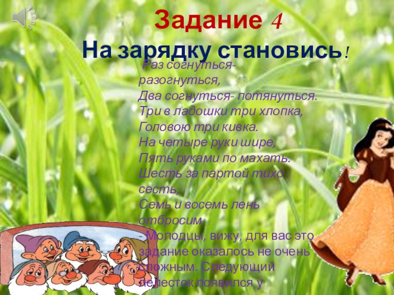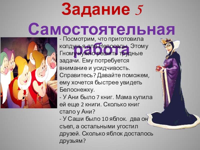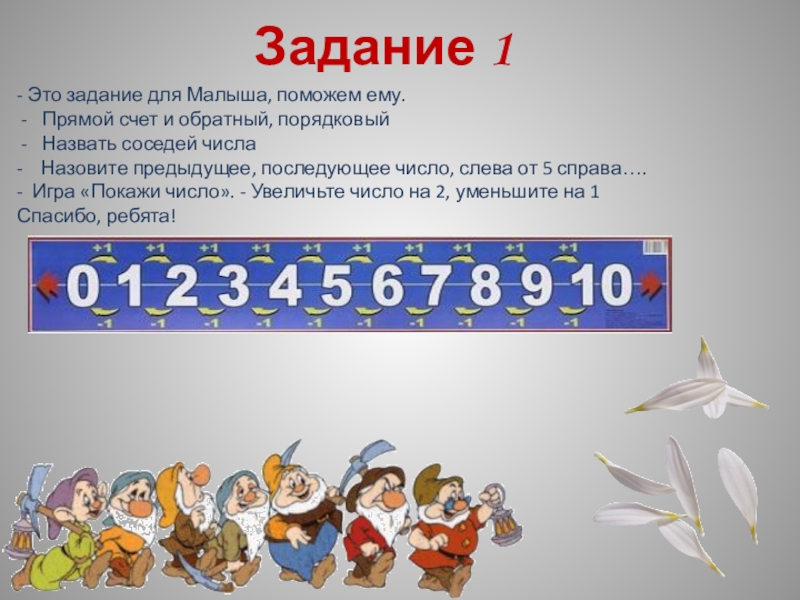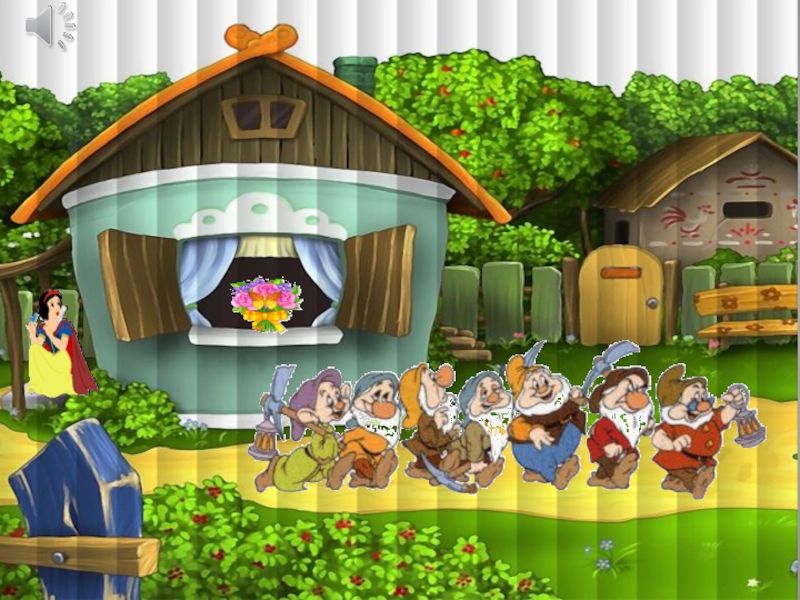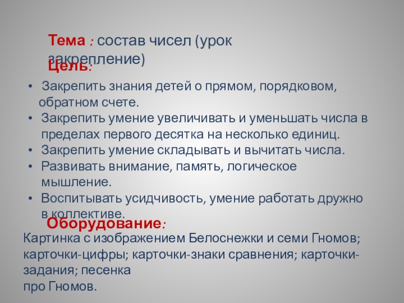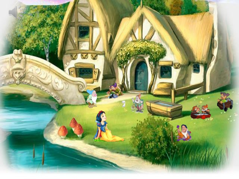 Картинка с изображением Белоснежки и семи Гномов; карточки-цифры; карточки-знаки сравнения; карточки-задания; песенка