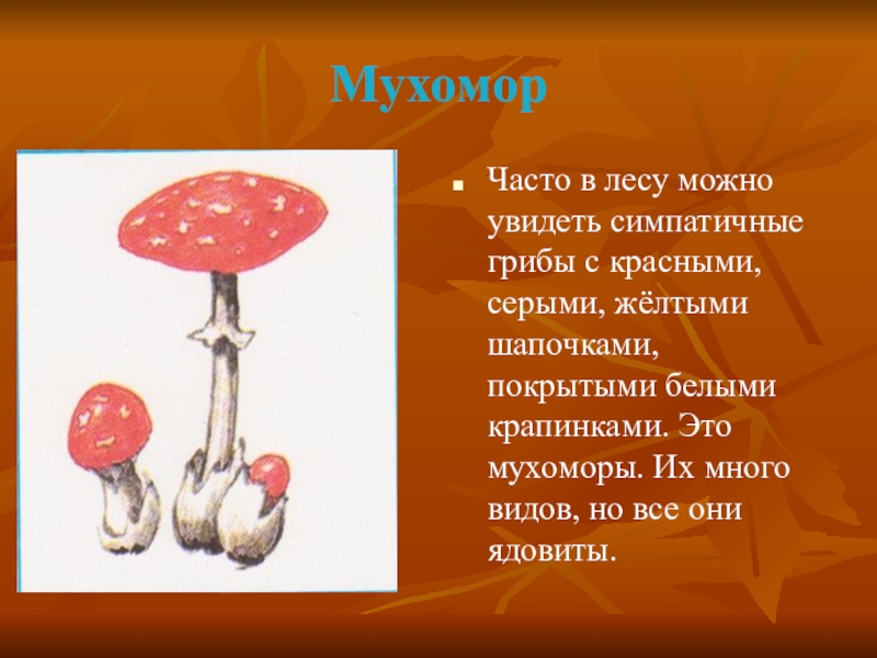 МухоморЧасто в лесу можно увидеть симпатичные грибы с красными, серыми, жёлтыми шапочками, покрытыми белыми крапинками. Это мухоморы.