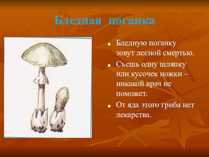 Бледная поганкаБледную поганку зовут лесной смертью.Съешь одну шляпку или кусочек ножки – никакой врач не поможет.От яда