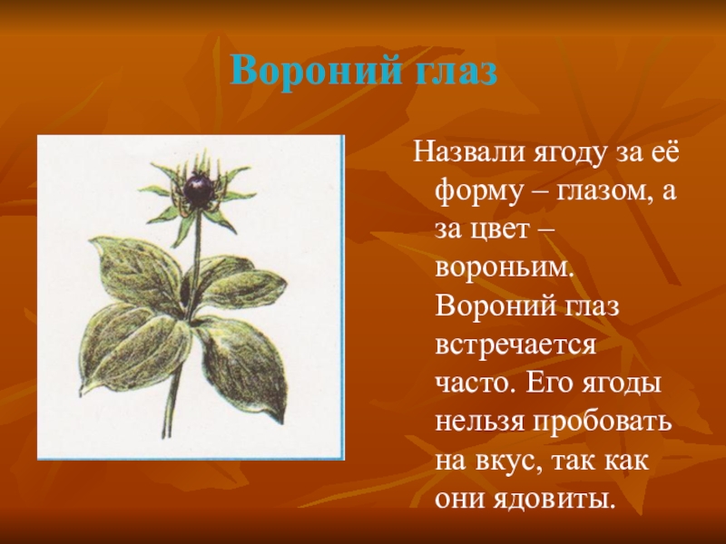 – вороньим. Вороний глаз встречается часто. Его ягоды нельзя пробовать на вкус, так как они ядовиты.