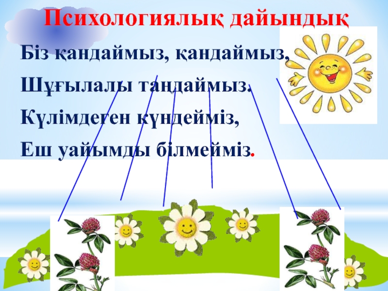 Біз қандаймыз, қандаймыз,Шұғылалы таңдаймыз.Күлімдеген күндейміз,Еш уайымды білмейміз. Психологиялық дайындық