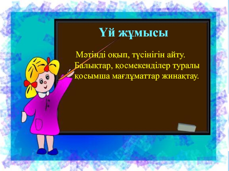 Мәтінді оқып, түсінігін айту.Балықтар, қосмекенділер туралы қосымша мағлұматтар жинақтау. Үй жұмысы