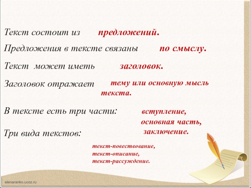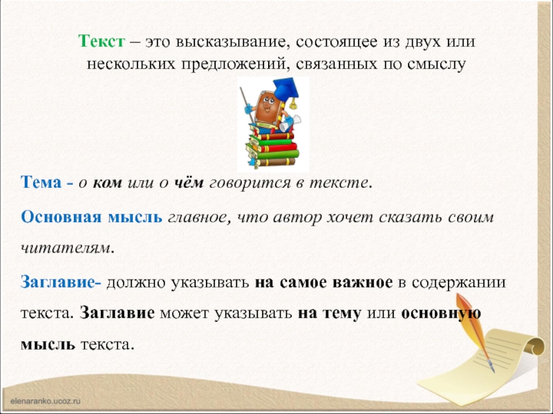 Заглавие- должно указывать на самое важное в содержании текста. Заглавие может указывать на тему или основную мысль текста.