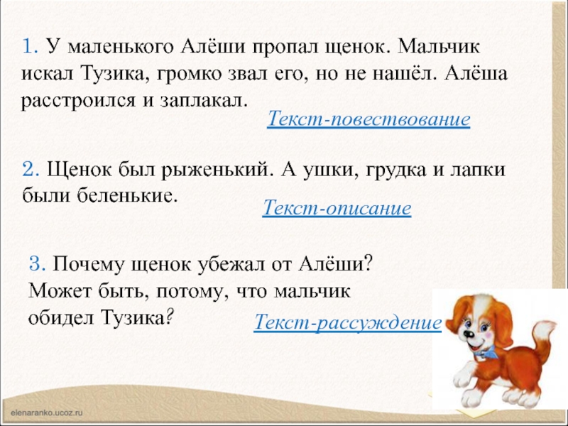2. Щенок был рыженький. А ушки, грудка и лапки были беленькие.