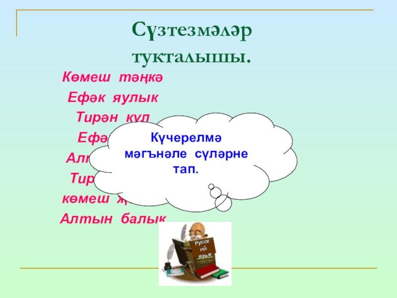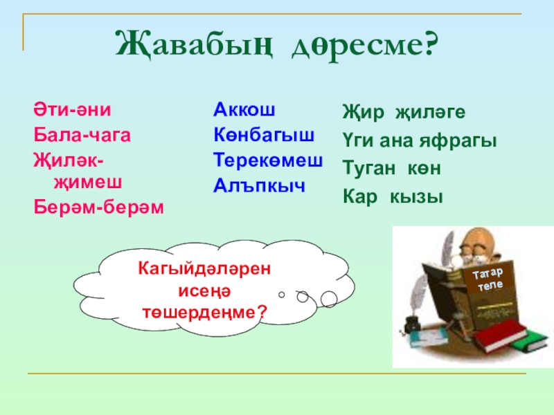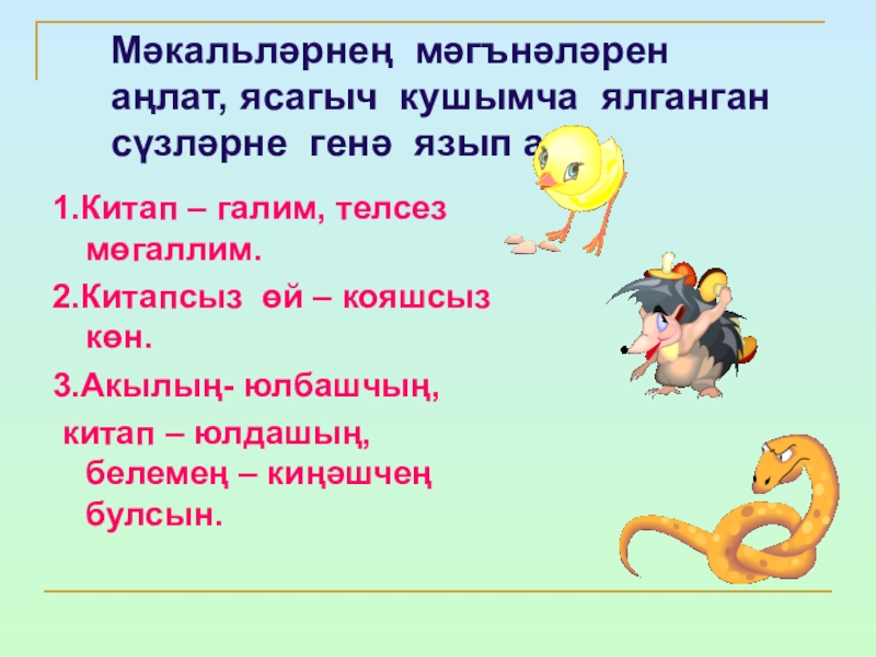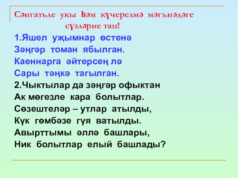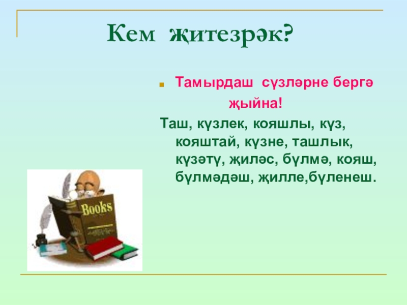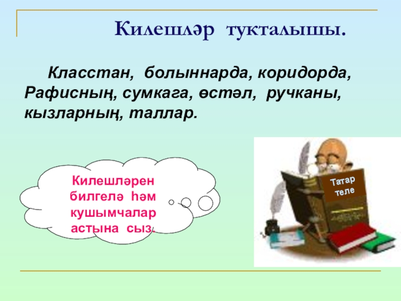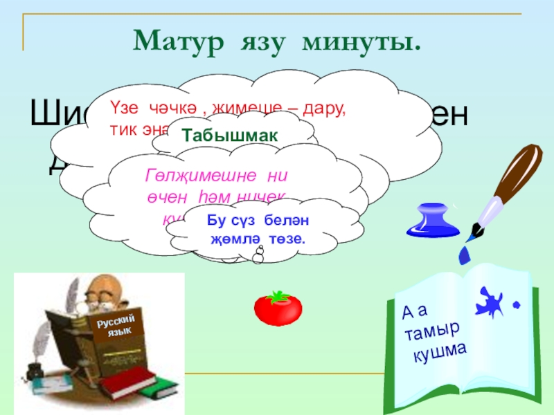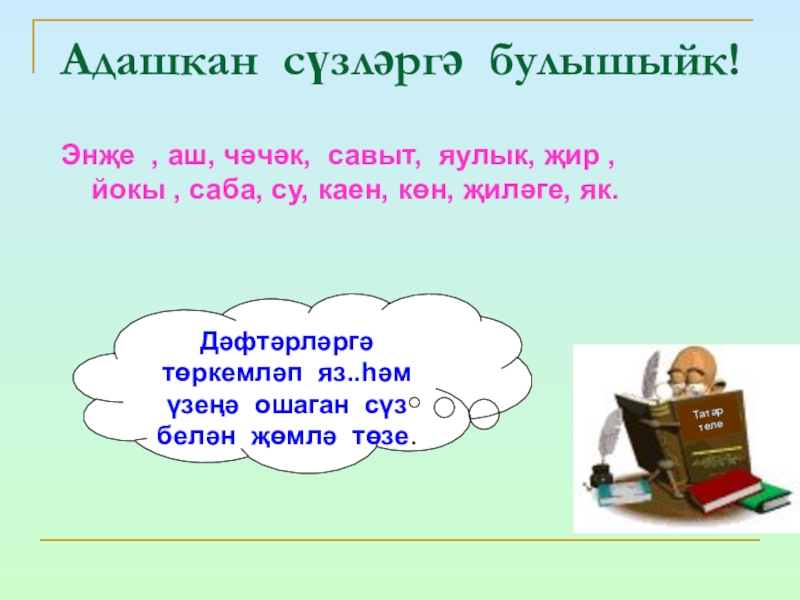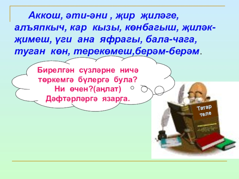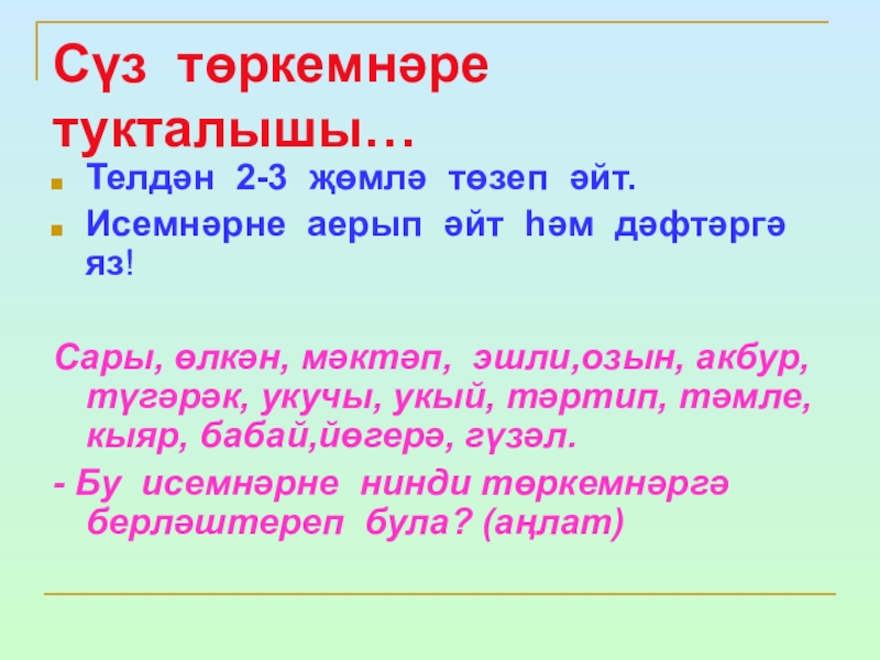 Дәфтәрләргә төркемләп яз..һәм үзеңә ошаган сүз белән җөмлә төзе.