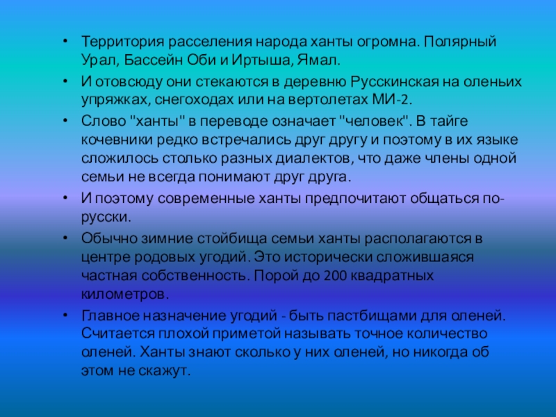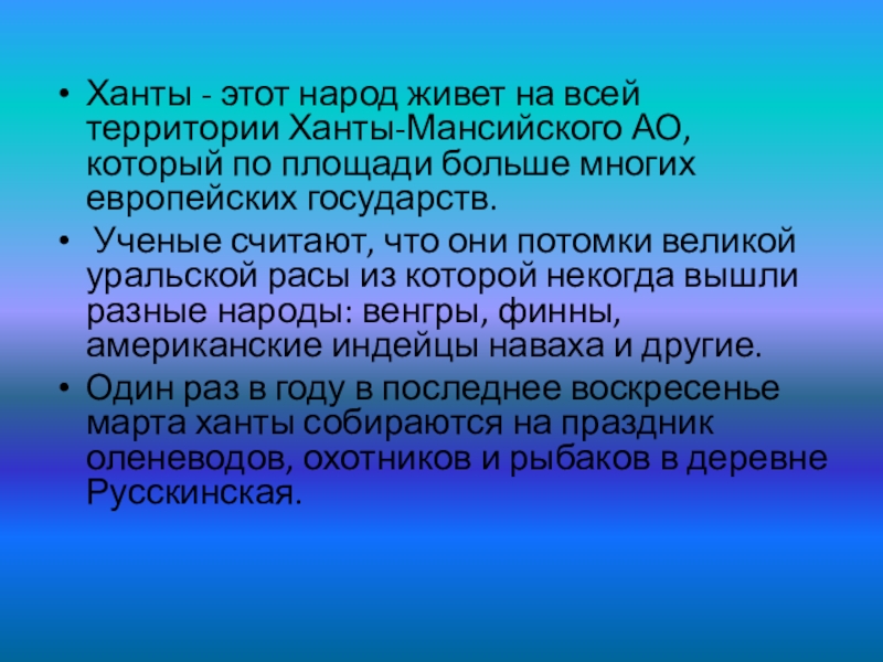 Ханты - этот народ живет на всей территории Ханты-Мансийского АО, который по площади больше многих европейских государств.