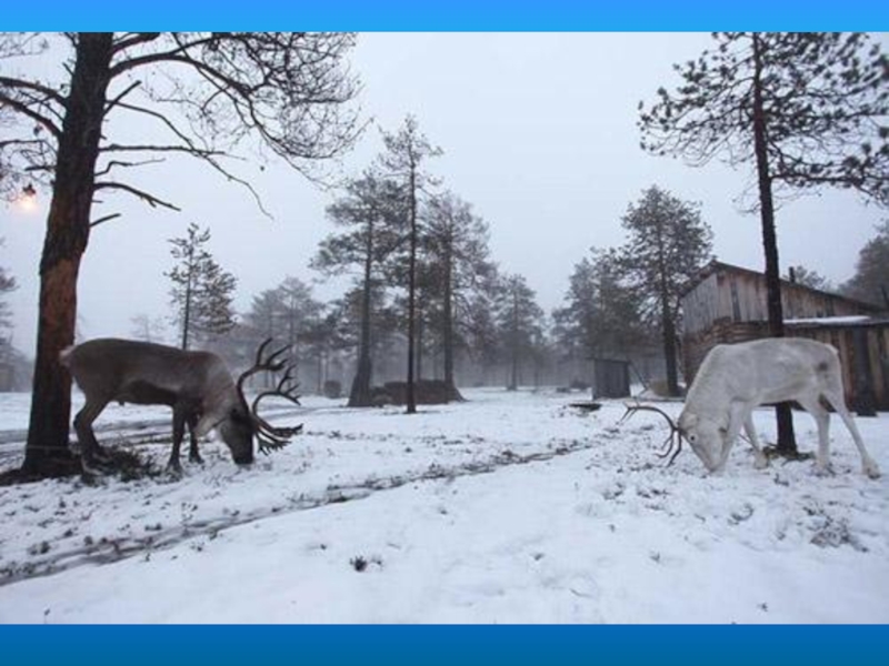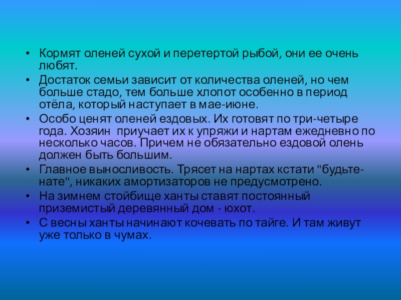 Слайд 7Кормят оленей сухой и перетертой рыбой, они ее очень любят.