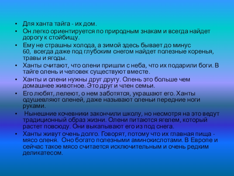 Ханты считают, что олени пришли с неба, что их подарили боги. В тайге олень и человек существуют вместе.