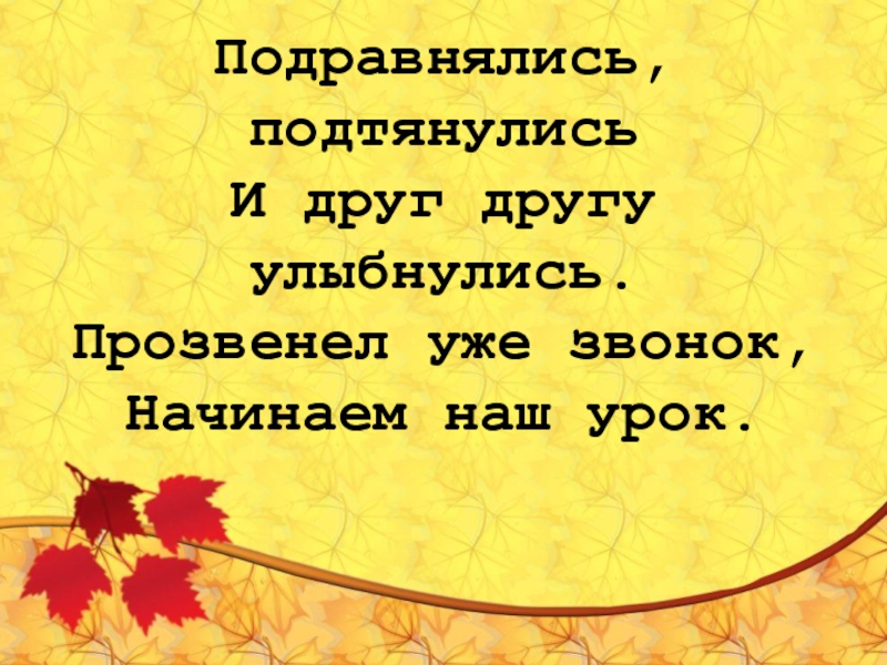 Слайд 2Подравнялись, подтянулись И друг другу улыбнулись. Прозвенел уже звонок, Начинаем наш урок.