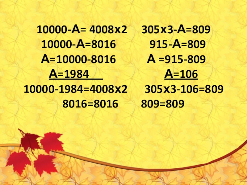 Слайд 31  10000-А= 4008х2 305х3-А=809 10000-А=8016 915-А=809 А=10000-8016